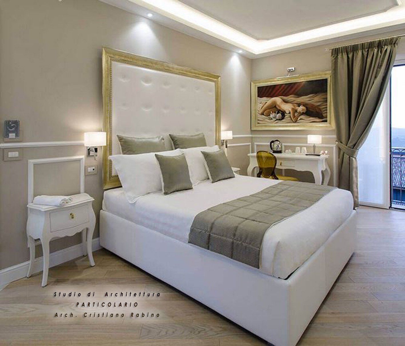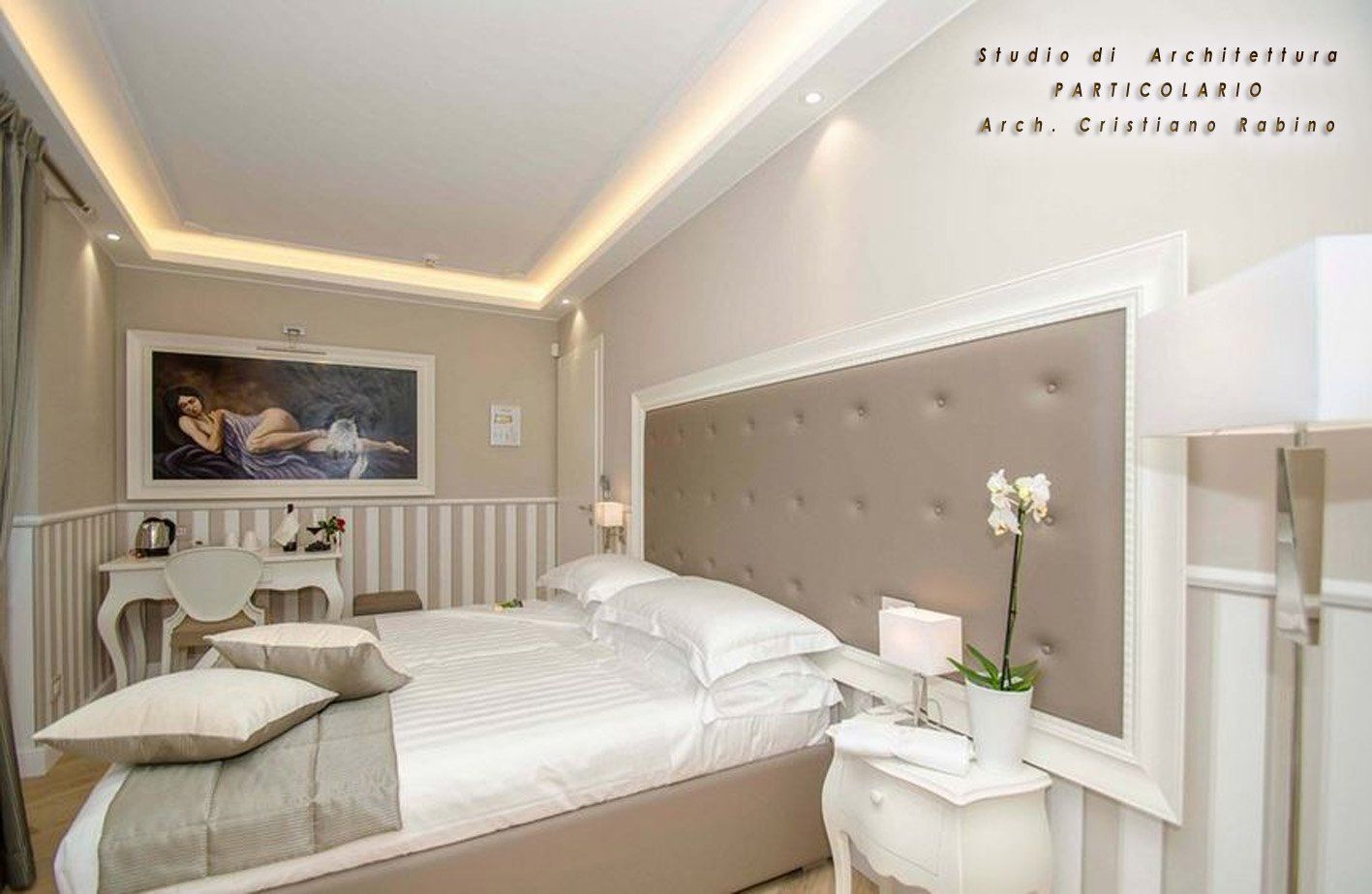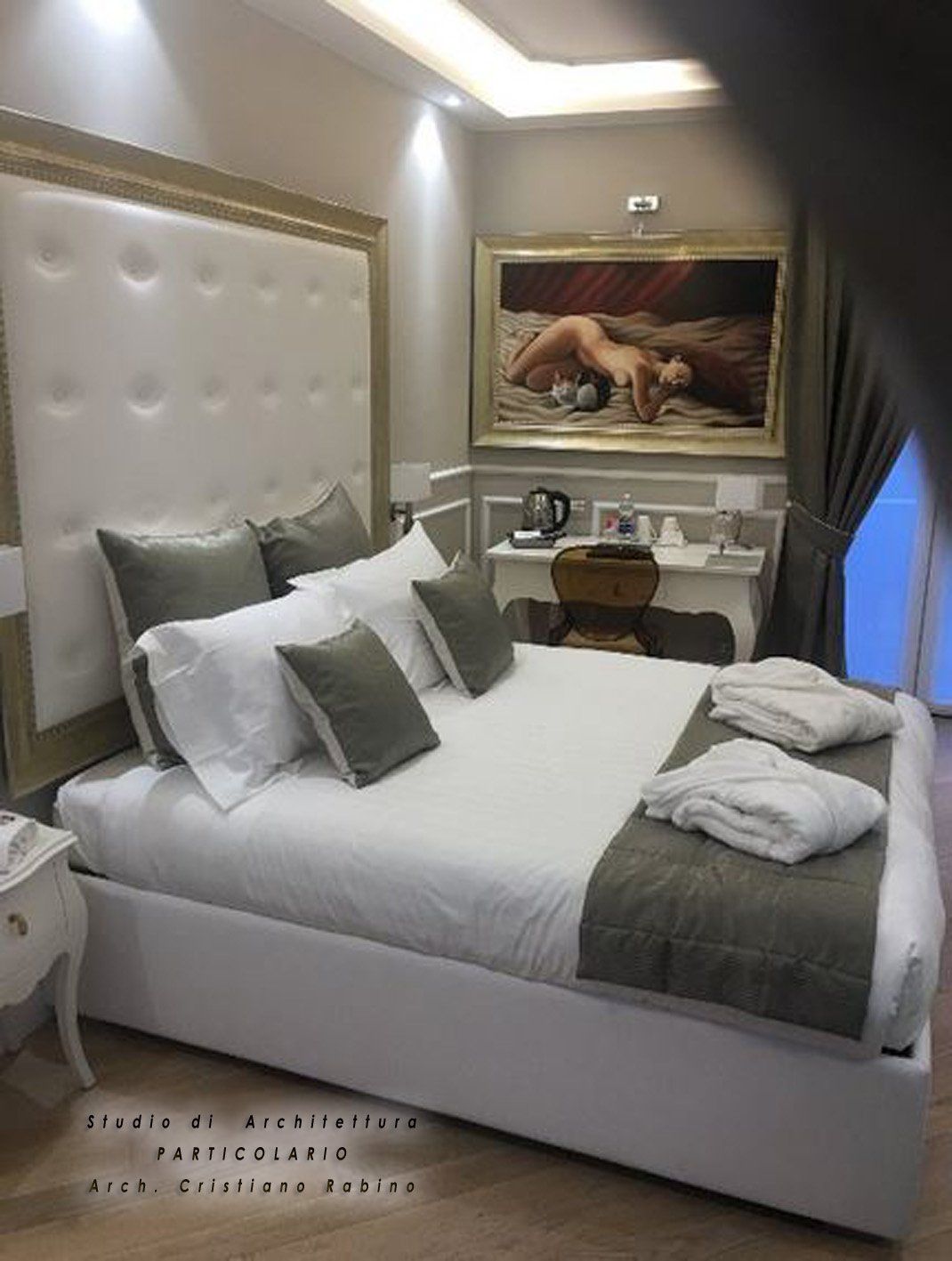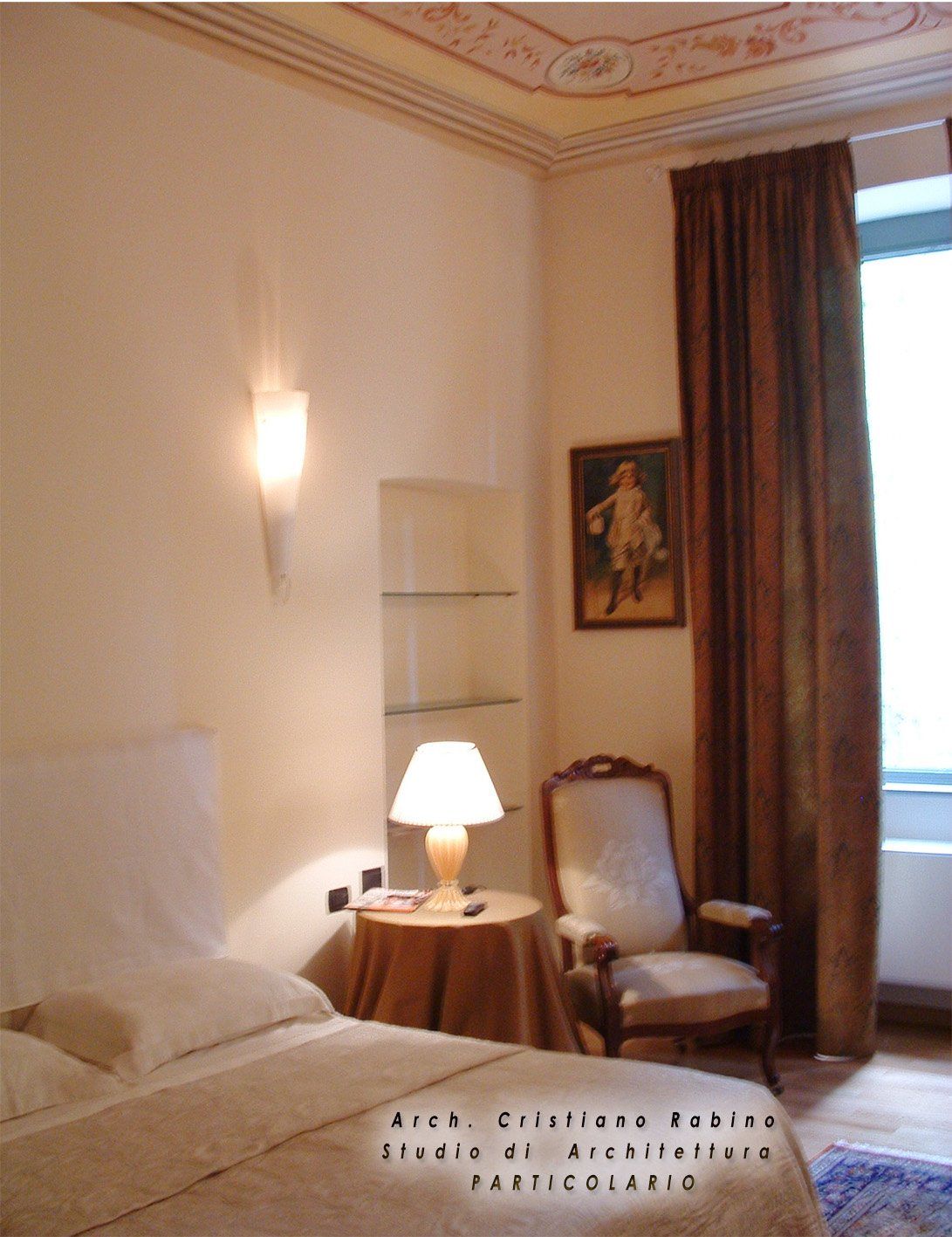La delicata scelta cromatica delle pareti e dei filati offrono un raffinato connubio stilistico. La proposta di arredi moderni e l'adeguamento tecnologico degli spazi si fondono con la storicità dell'edificio, preservandone i criteri stilistici originari.