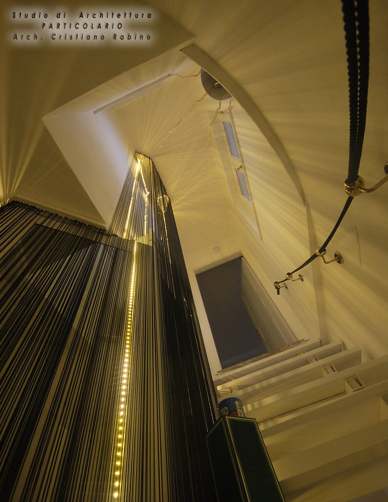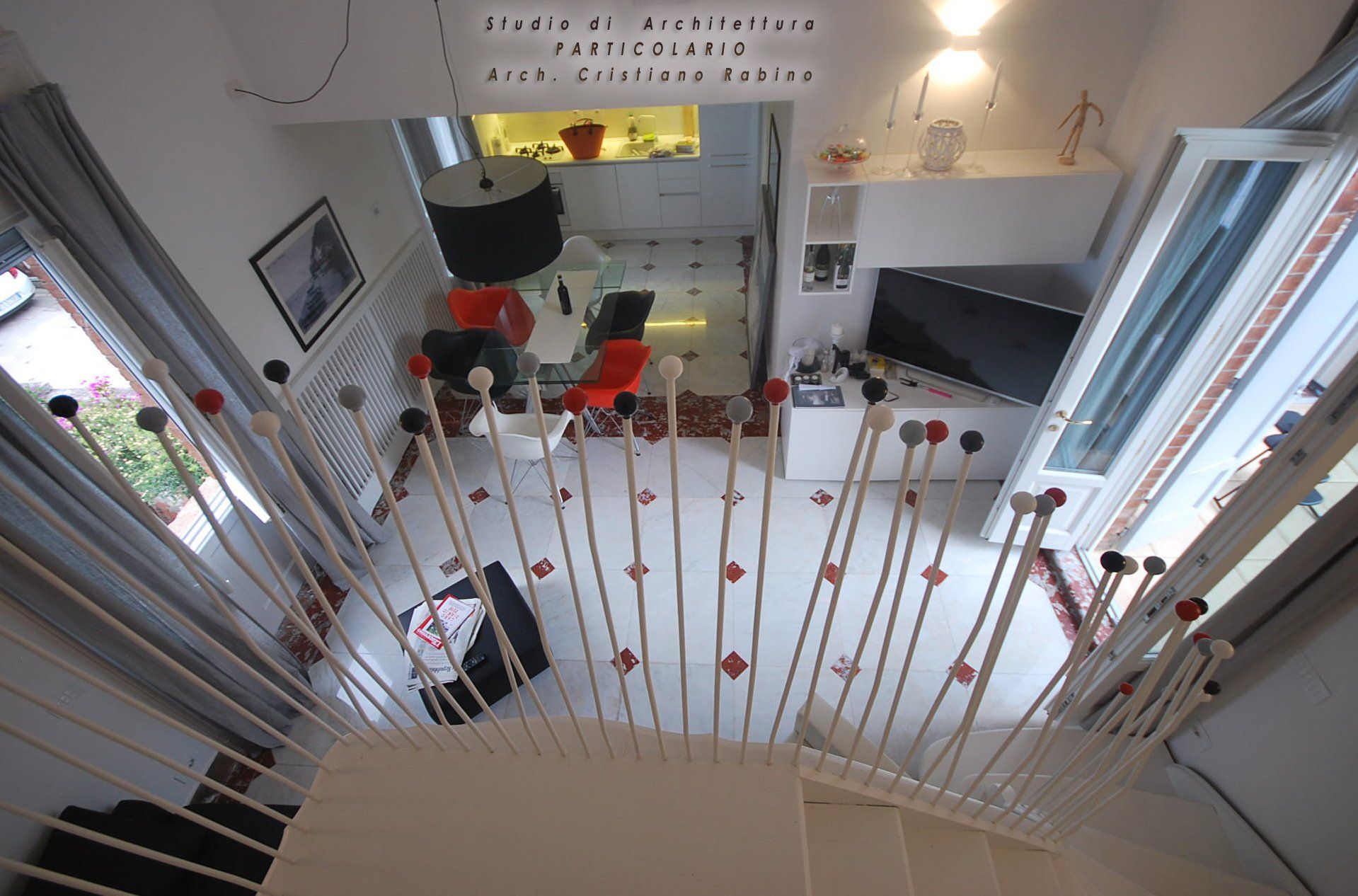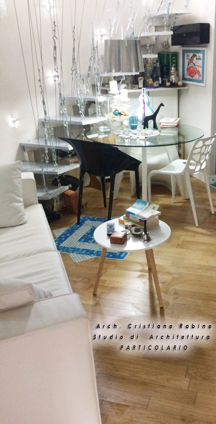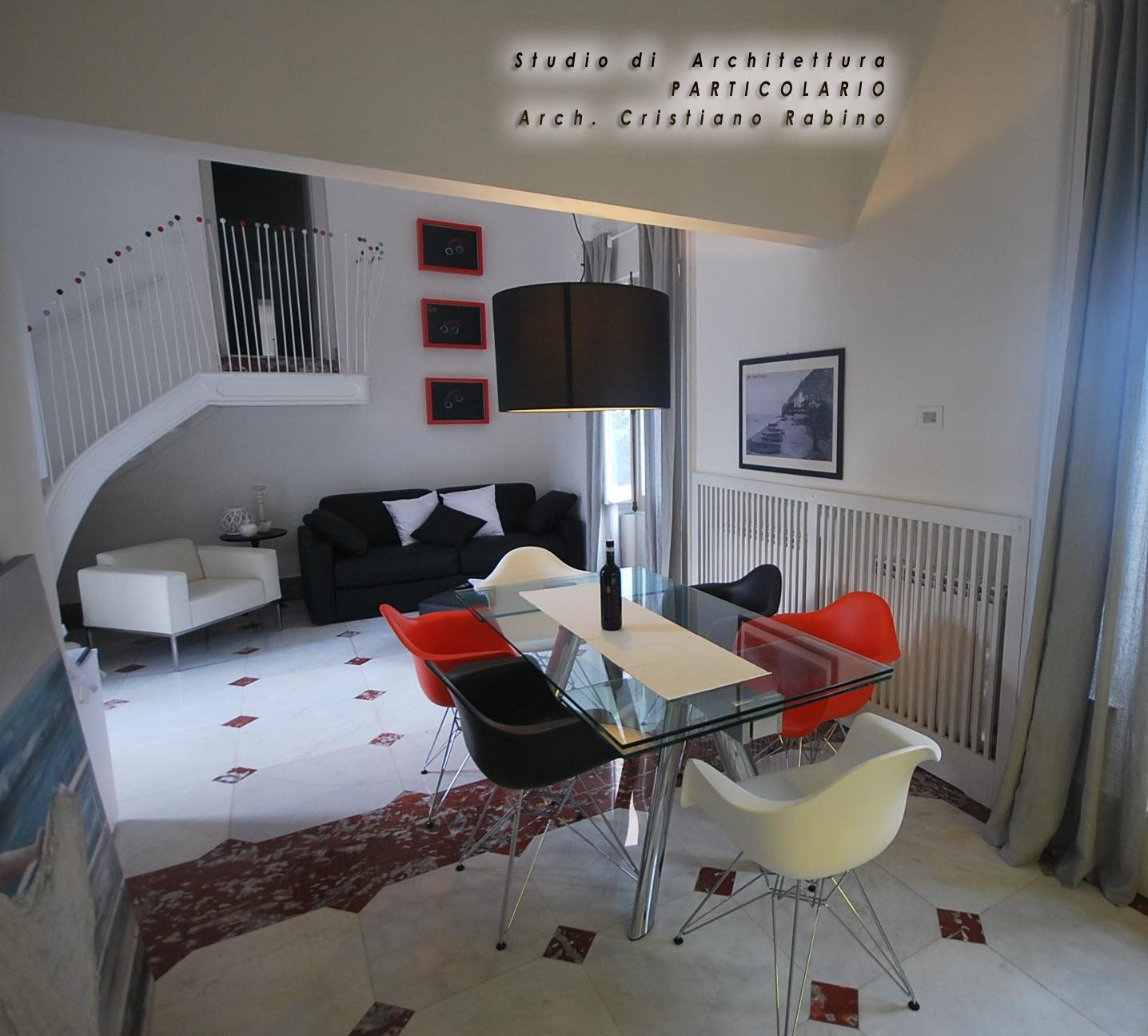 E' una ristrutturazione completa di appartamento in edificio di notevole pregio storico con affaccio sul mare. I luoghi, a differenza dell'originaria costruzione con altezze di 6 mt., dopo una precedente ristrutturazione, si presentano con un soppalco che divide gli ambienti.