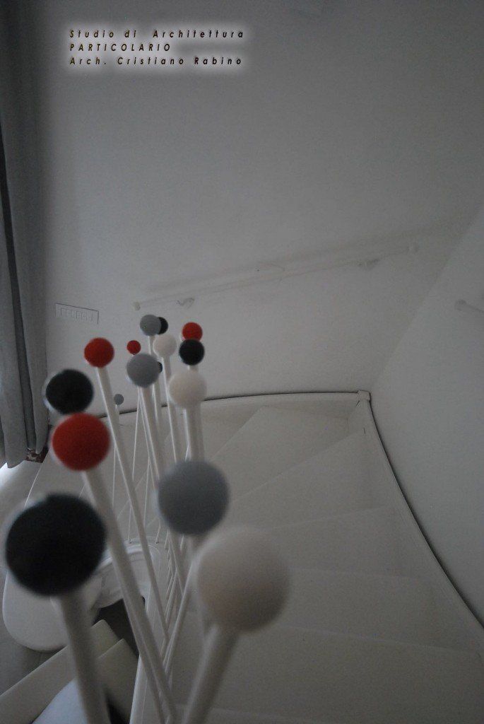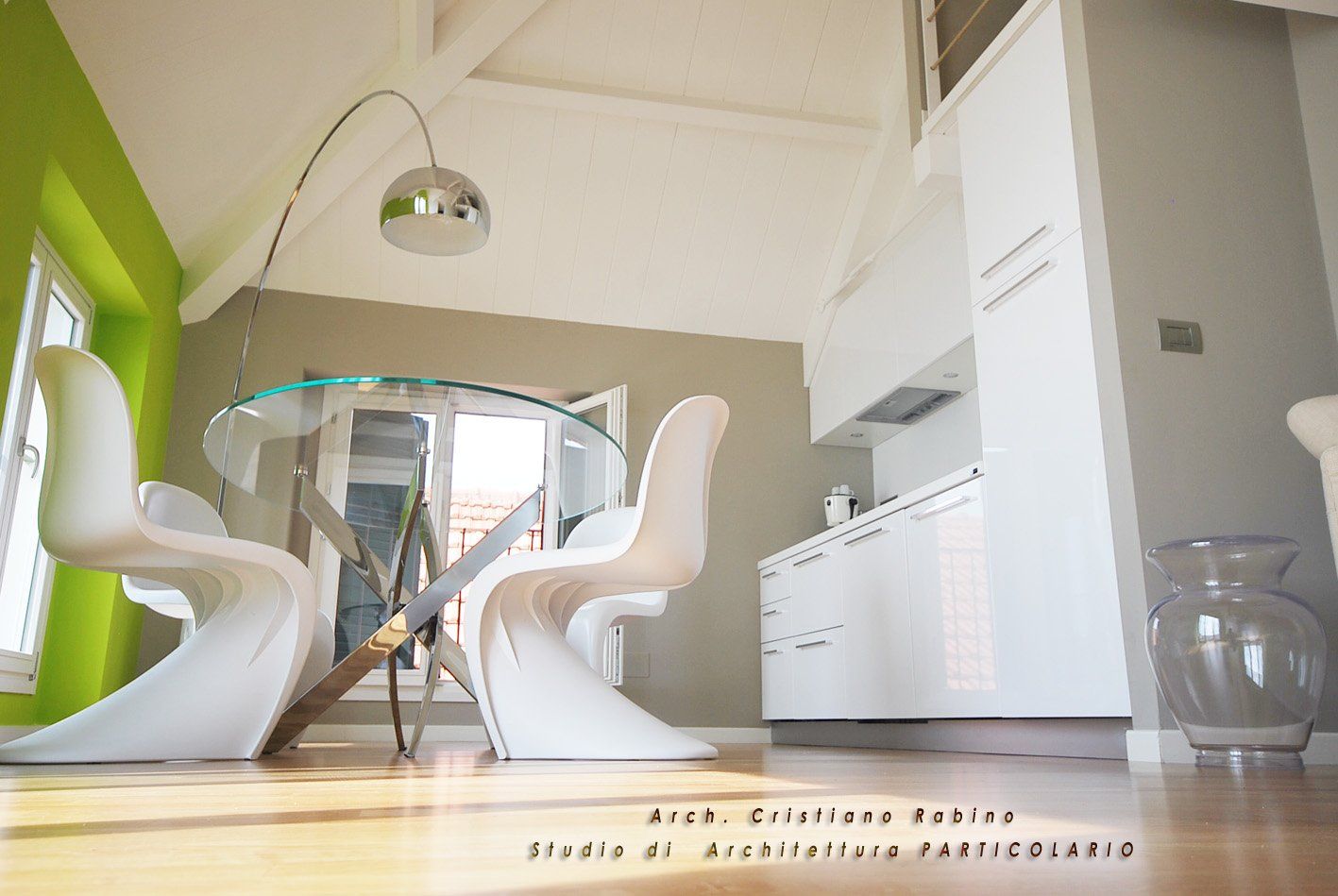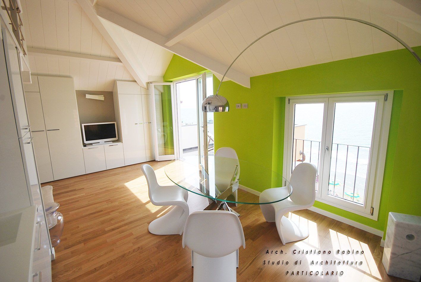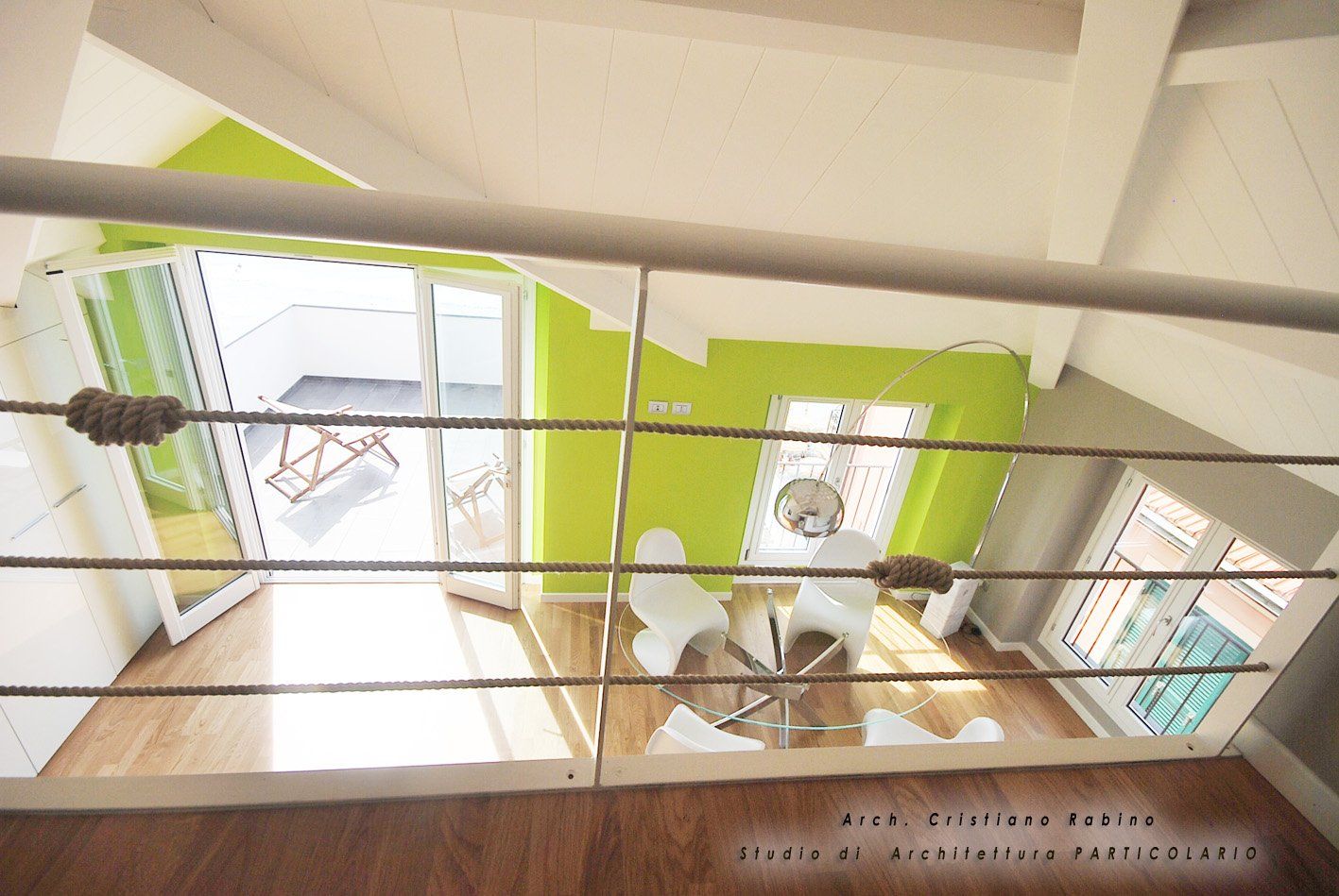 Gli arredi di design, con tonalità accese e vivaci, sono accompagnati da dettagli costruttivi personalizzati. La particolarità strutturale dell'attico permette la realizzazione di un gioco, basato su contrasti ed armonie in legame con l'autenticità degli ambienti.