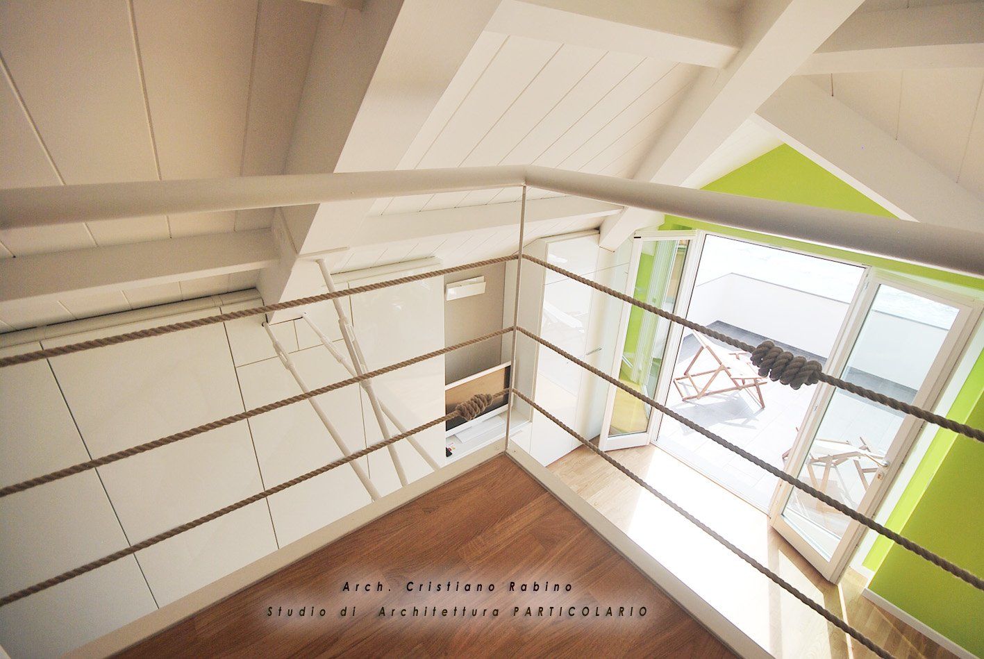 Il progetto è destinato a riutilizzare un ultimo piano mansardato di un edificio con affaccio sul mare. L'ampia copertura lignea a vista, alleggerita dalle tonalità del bianco, oltre alle rilevanti altezze presenti, consente la costruzione di un soppalco. Dal punto di vista stilistico e della ricerca architettonica, la progettazione ed annessa scelta di materiali impiegati, richiamano il mondo nautico.